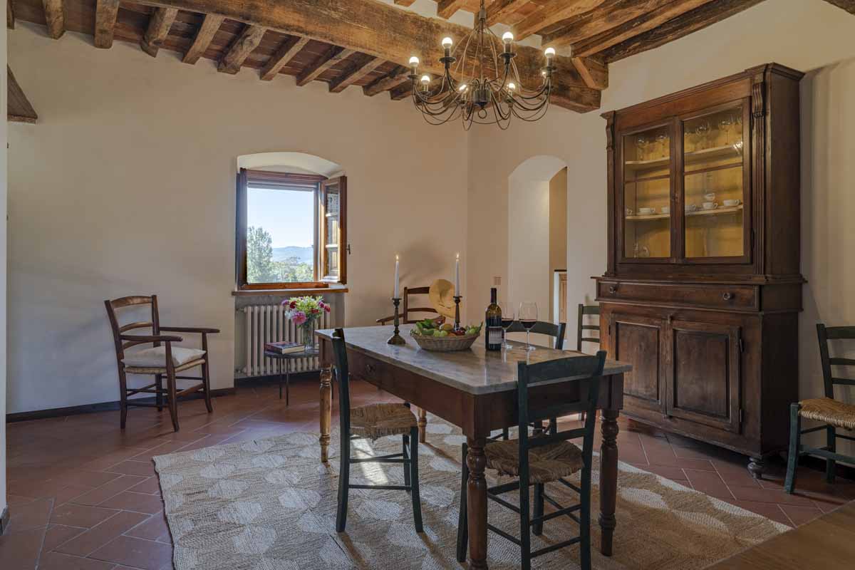 Il Gelso fa parte della casa colonica principale; è dotato di ingresso indipendente e di un giardino privato, arredato per la vita all'aperto. L’appartamento è articolato su 3 piani. Al piano terra troviamo la sala da pranzo con camino, dalla quale si accede al giardino privato, e la cucina separata e ben attrezzata. Il primo piano comprende un soggiorno luminoso ed una gradevole camera da letto, con il proprio bagno sullo stesso piano. All’ultimo piano è situata un’ampia camera da letto con vedute panoramiche della vallata, un’altra camera da letto ed uno spazioso bagno.